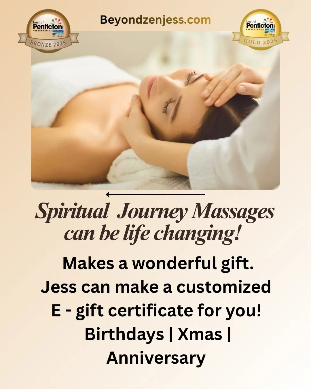 Winning GOLD for best reiki practitioner in 2024 & 2025. Silver for best naturopathic massage & body work in 2024 and Bronze in 2025. She also won Bronze for best wellness fair or events in Penticton.